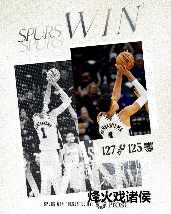 文班亚马17投11中。三分9中5、罚球9中7,砍下34分14篮板11助攻的三双数据率队取胜。